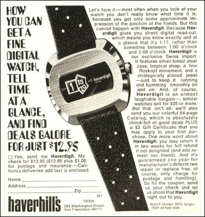 Let's face it - most often when you look at your watch you don't relly know what time it is, because you get only some approximate impression of the position of the hands. But this cannot happen with Haverdigit. Because Haverdigit gives you direct digital read-out, which means you know exactly and at a glance that it's 1:17, rather than sometime between 1:00 o'clock and 2:00 o'clock. Haverdigit is our exclusive Swiss import. It features silver-toned steel case, tropical strap, a fine Roskopf movement, and a strategically placed jewel - just to keep it running and humming smoothly on and on. And, of course, Haverdigit is an almost laughable bargain - similar watches sell for $25 or more. But that it's all: we'll also send you our colorful 64-page Catalog, which is absolutely chock-full of good deals PLUS a $2 Gift Certificate that you may apply to your first purchase. One more word about Haverdigit: you may return it in two weeks for a full refund if not delighted (and still remain our friend). And it's guaranteed one year for manufacture's defects (we repair or replace free, of course, only charge for postage and handling). So fill in the coupon, send us your check and let us shoot that Haverdigit right out to you. Watch shown 20% larger than actual size.