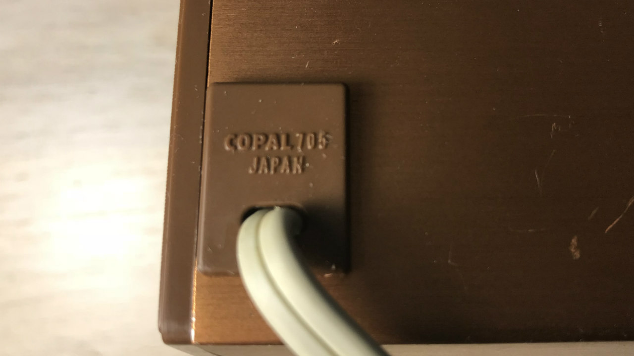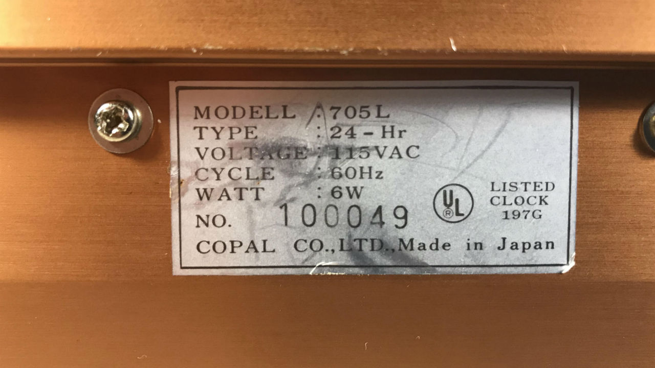 The Copal Model 705L - a black light flip clock alarm with an anodized aluminum wrap around case, plastic end pieces and knobs.