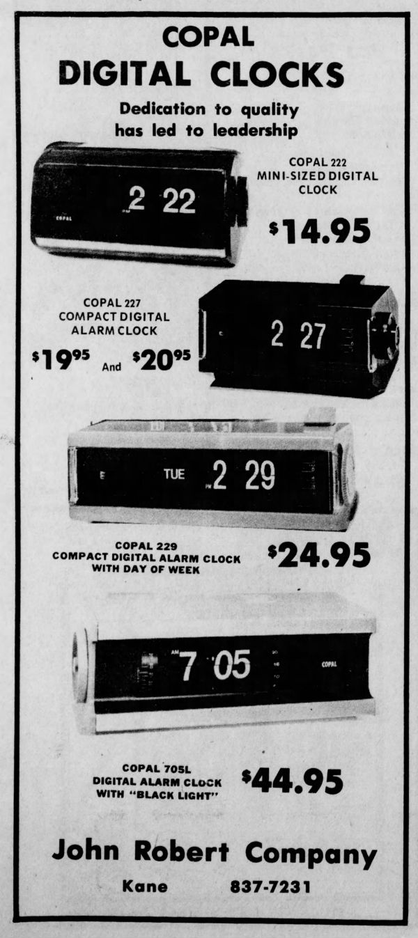 In Advertising the clock is noted to appear in a newspaper ad in 1974, alongside the Copal 222, 227 and 229 . These clocks at the time were priced between $15-25 dollars. The Copal 705L was nearly double this at about $45.00. Clearly it was a higher end clock attempting to appeal to the higher income crowd. The clock was described as "Copal 705L Digital Alarm Clock with 'Black Light'. "