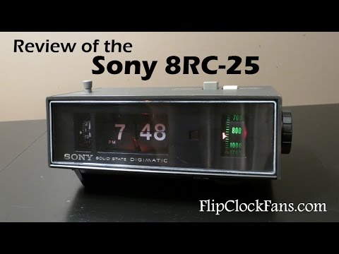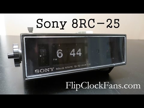 The Sony 8RC-25 Digimatic AM Clock Radio Alarm - Made by Sony, Japan, the clock measures: 8 1/4 (W) 3 15/16 (H) X 5 1/8 (D) (210 X 100 X 130 mm) and features AM radio, wake to radio or buzzer, and clock digits illuminated by an orange neon glow lamp. The clock originally featured a "dark gray" (pictured here) and an "ivory" colored cabinet. When playing, the radio dial lights up, appearing green due to the colored plastic used in construction of the radio tuning dial.